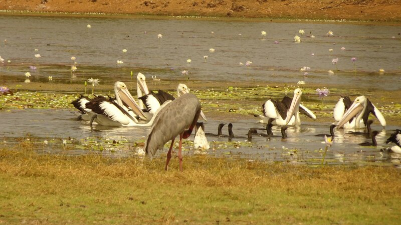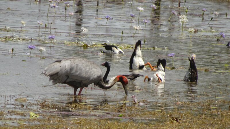 So far I have seen magpie geese, kites, pelicans, magpie larks (pee wees), a lone rainbow bee eater, straw necked ibis, sarus cranes (close cousins of brolgas), ducks, egrets, masked lapwings (plovers) and jacanas.